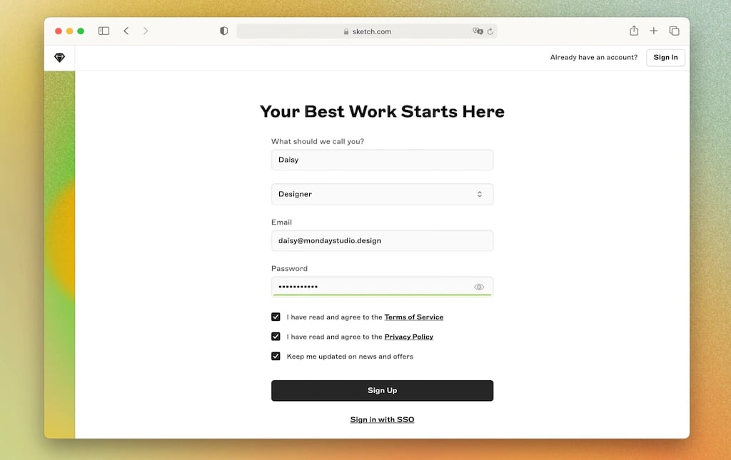首先请 注册一个 Sketch 账户 (opens new window)。如果你想为你的团队创建一个办公空间,我们建议用一个与你公司相关的电子邮件地址进行注册。