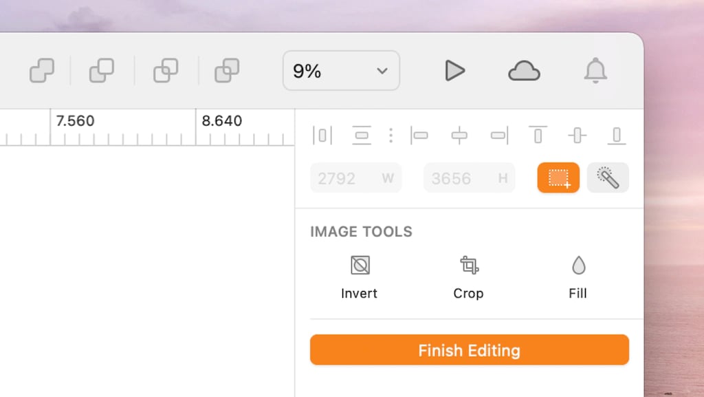 Mac 应用程序有一些简单的位图图像编辑工具。要使用它们,请先在你的画布上选择一个图像,然后双击它,进入编辑模式,然后右侧属性栏中有两个工具可以供你选择。