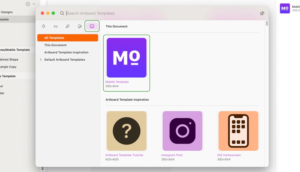 你可以为你的画板模板创建自定义预览缩略图,方法是在同一个文档或库中添加一个名称为 Previews/Artboard_Template_Name 的画板。