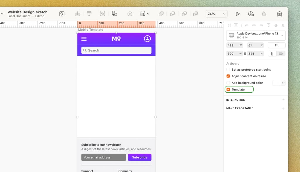 要将任何画板保存为模板,选择一个画板,然后在右侧属性栏中启用 模版 选项。