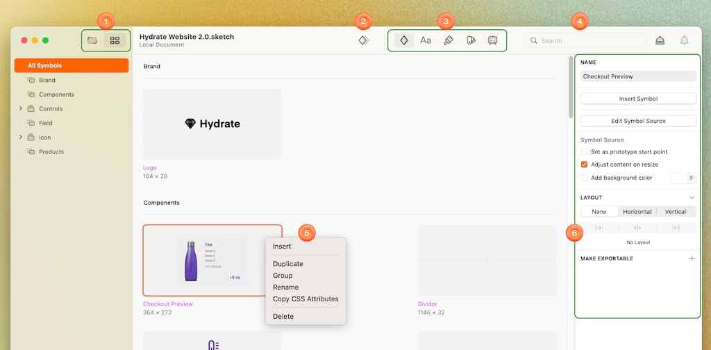 5. 右键菜单 :在组件缩略图上右键,可以插入、重命名、分组、复制、删除或复制其 CSS 属性。当你插入一个组件时,Mac 应用程序会切换到 Canvas 视图,然后你可以把你的组件放到你的设计中。