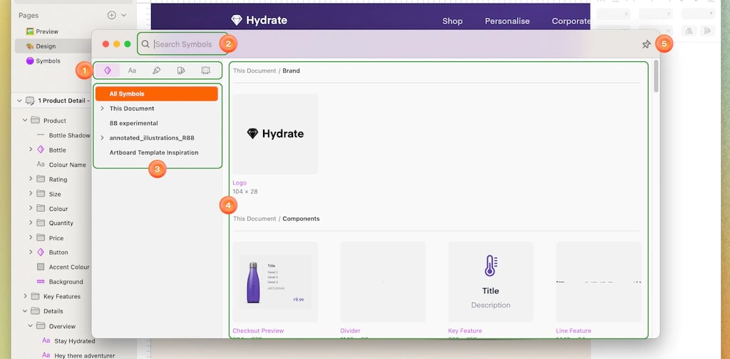 选择你要找的控件、文本样式、图层样式、颜色变量或画板模板,并将其拖放到你的画布上。